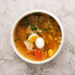 We cook a fragrant broth with vegetables and stewed chicken thighs. We add pasta, quail eggs, and parsley to make it light but rich. This dish envelops you in warmth and always reminds you of home.