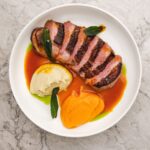 Marinated duck breast grilled to perfection with crispy skin. Served with two types of purée: pumpkin and sea buckthorn, and parsnip, citrus sauce, and herb oils.
