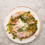 Neapolitan pizza on 48-hour dough with mortadella, stracciatella, pistachios, and basil pesto. Rich, aromatic, with a distinct Italian character.