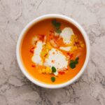 We cook it in coconut milk with white wine and vegetables. We add marinated pumpkin with citrus notes — lime and lemon zest, ginger, tiger prawns, and stracciatella — and the soup becomes a real delicacy.