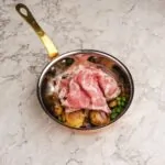 Запечена картопля з зеленим горошком, часником конфі та спеціями, подається з тонко нарізаною панчеттою аролата та соусом із в’ялених томатів і каперсів.