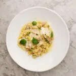 Домашнє рагу з фермерської курки вільного вигулу, тушкованої з цибулею та селерою в бульйоні, поєднується з пастою та лисичками . Подається з зеленню та пармезаном.