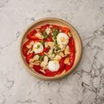 Запечений болгарський перець, маринований у бальзамічному соусі, ми поєднуємо з ніжною збитою рікотою та свіжим соусом сальса верде.