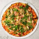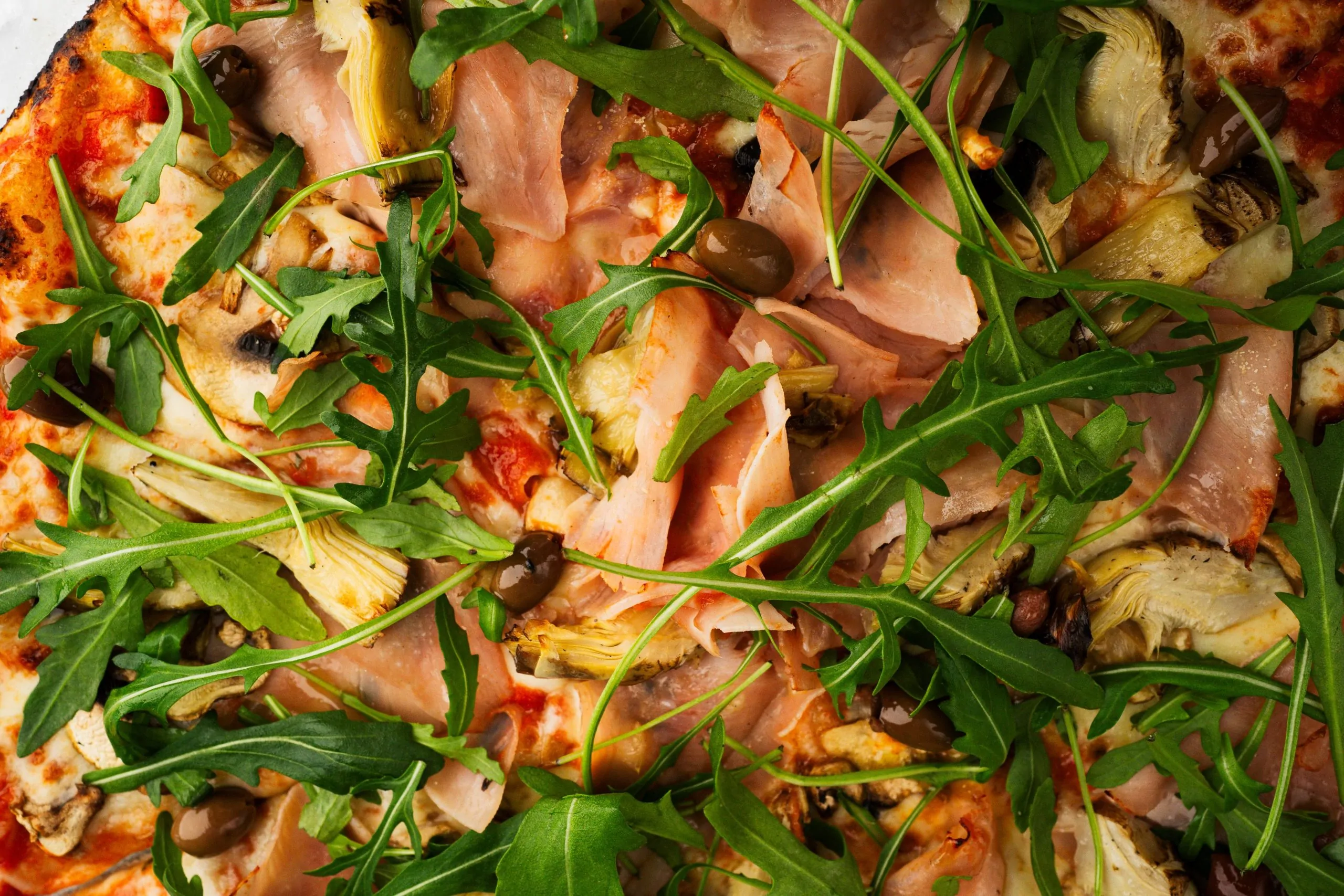 Насичений томатний соус, тягуча моцарела, соковите прошутто котто, артишоки, оливки Каламата, печериці, рукола та оливкова олія.