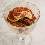 Класичний італійський десерт у нашій авторській подачі. Савоярді, просочене кавою, бренді та вином Марсала, гарячий шоколад, хрусткий шар із печива Амаретті та легкий крем на основі жовтків і маскарпоне.