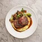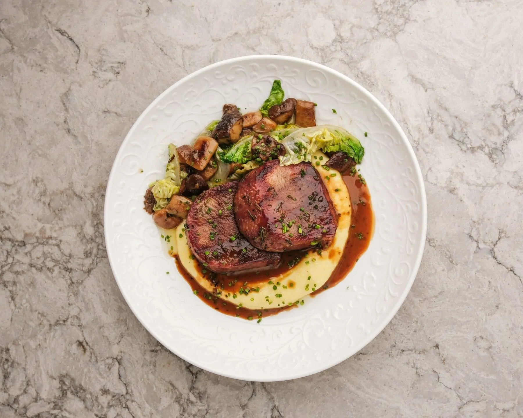 Ніжно томлений яловичий язик подається на кремовій поленті, з пікантним соусом пеперкорн, на основі червоного вина ,вершків і зеленого перцю. Страву доповнюють ароматні смажені білі гриби та припущене листя бейбі-ромену, що додає свіжості й легкої гірчинки.